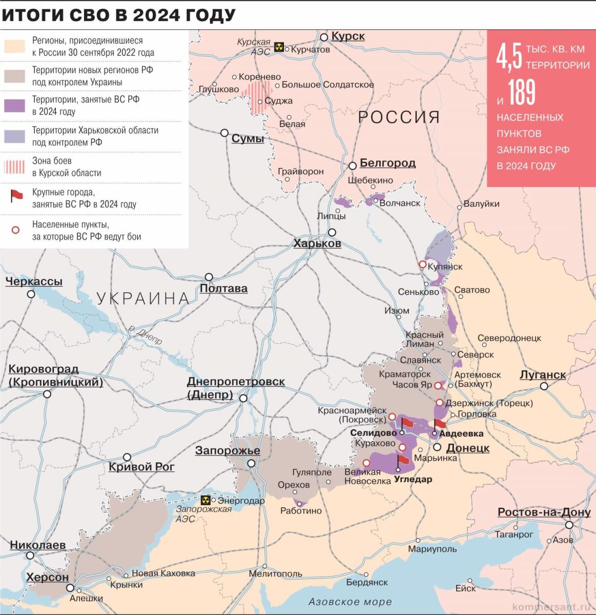 2024'te ele geçirilen alanın büyüklüğü 4,5 bin km2 idi. Rusya ayrıca bu yıl 300’den fazla yerleşim yeri üzerinde kontrol sağladı. 2024’te bu sayı 189 olmuştu.